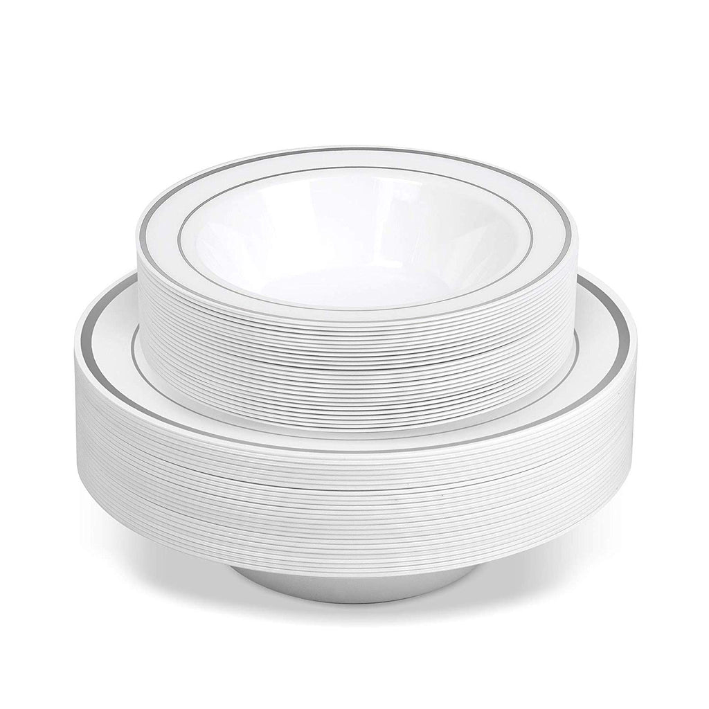 50 Disposable White Silver Rimmed Heavy Duty Plastic Bowls | 25 14 oz. Soup Bowls and 25 6 oz. Dessert/Appetizer Bowls | Premium Combo Disposable Dinnerware with Real China Design | Great for Parties ...
