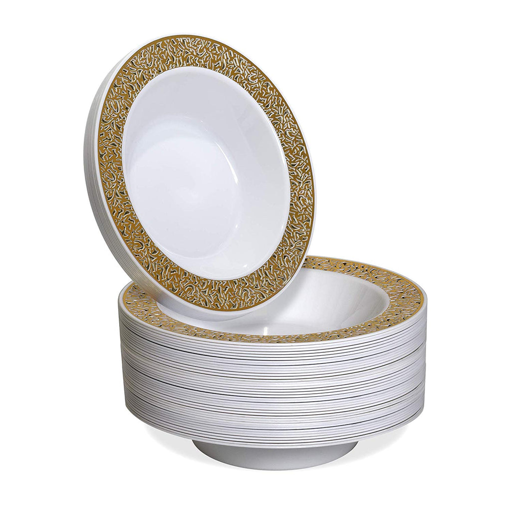 BloominGoods - Disposable Plastic plates, White with GOLD LACE - 14-Ounce Soupe Bowls (50-pack)