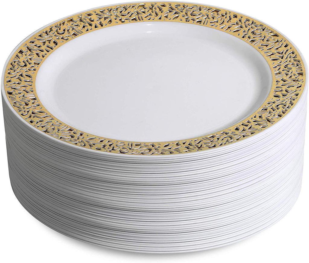 • ELEGANT DESIGN: Boasting a design of a classy and elegant serve ware, disposable plates can be used at weddings, parties, social activities or when you find your regular dinner plates too boring. The high gloss finish and the elegant gold lace Rim give them a look which is similar to China or porcelain dishes.