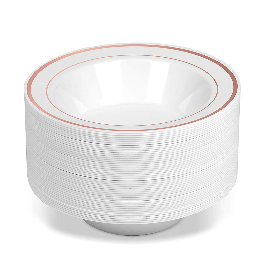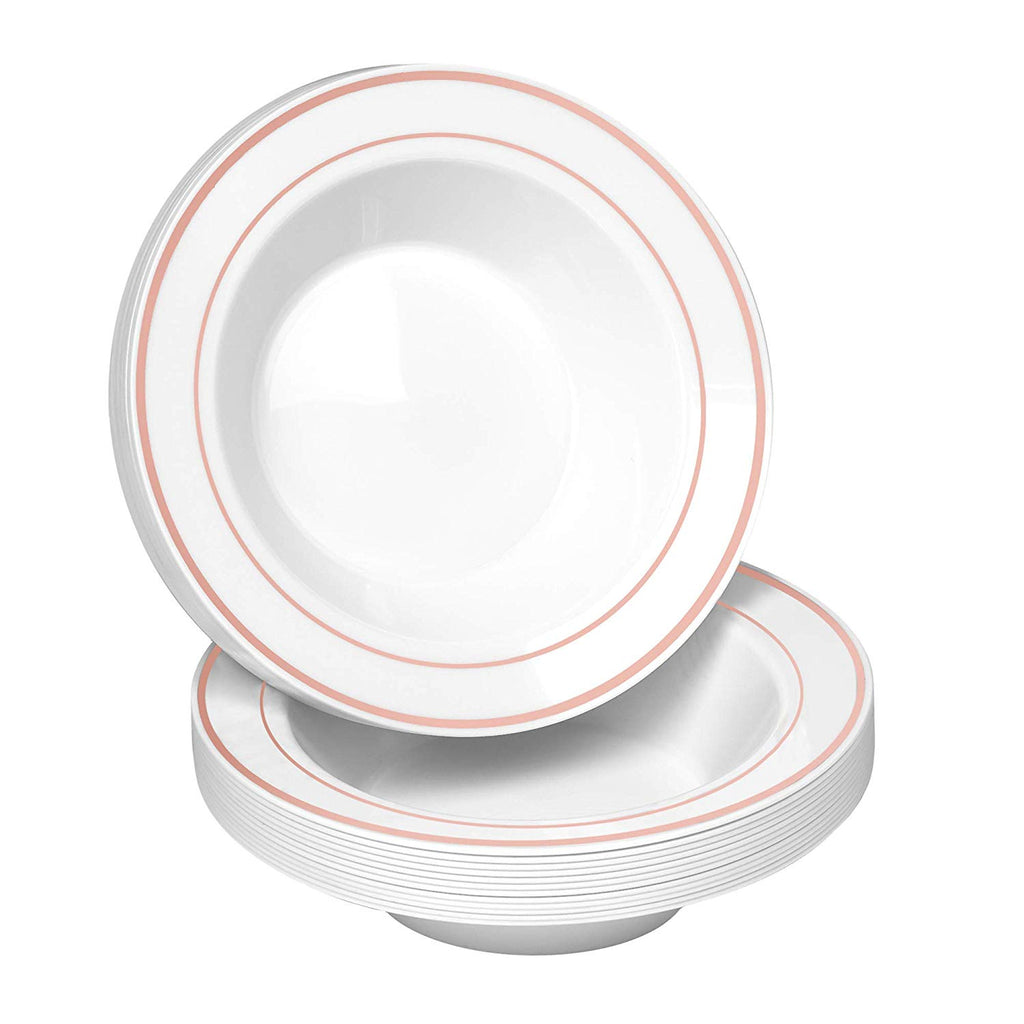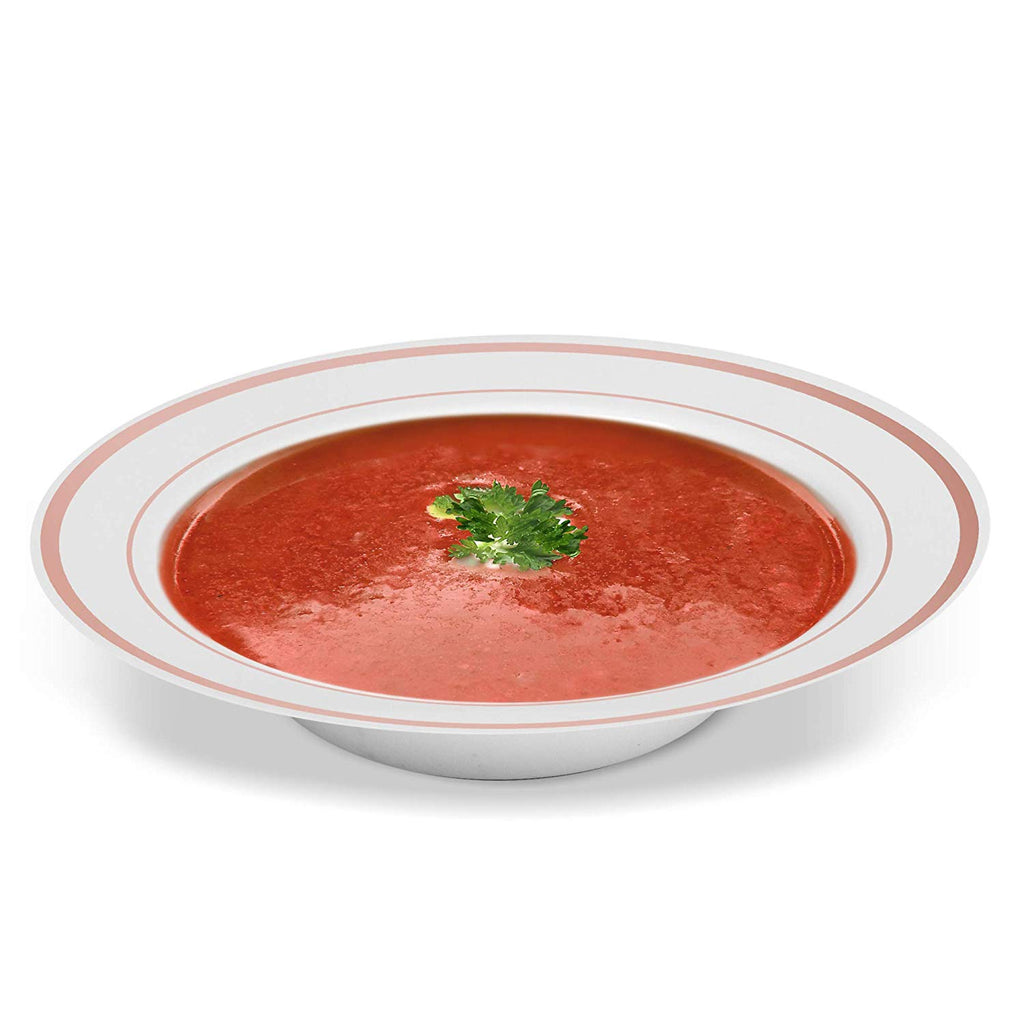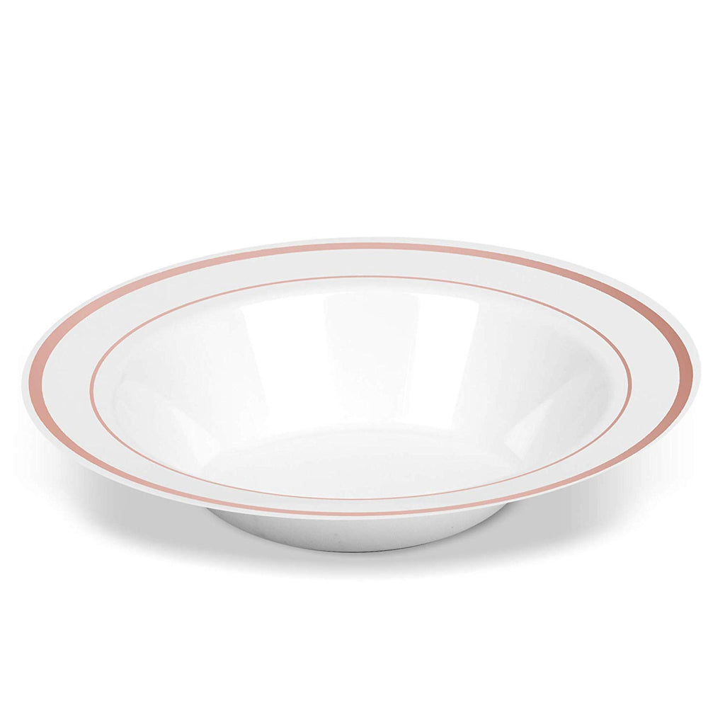 BloominGoods - Disposable Plastic plates, White with ROSE GOLD Rim - 14-Ounce Soupe Bowls (100-pack)