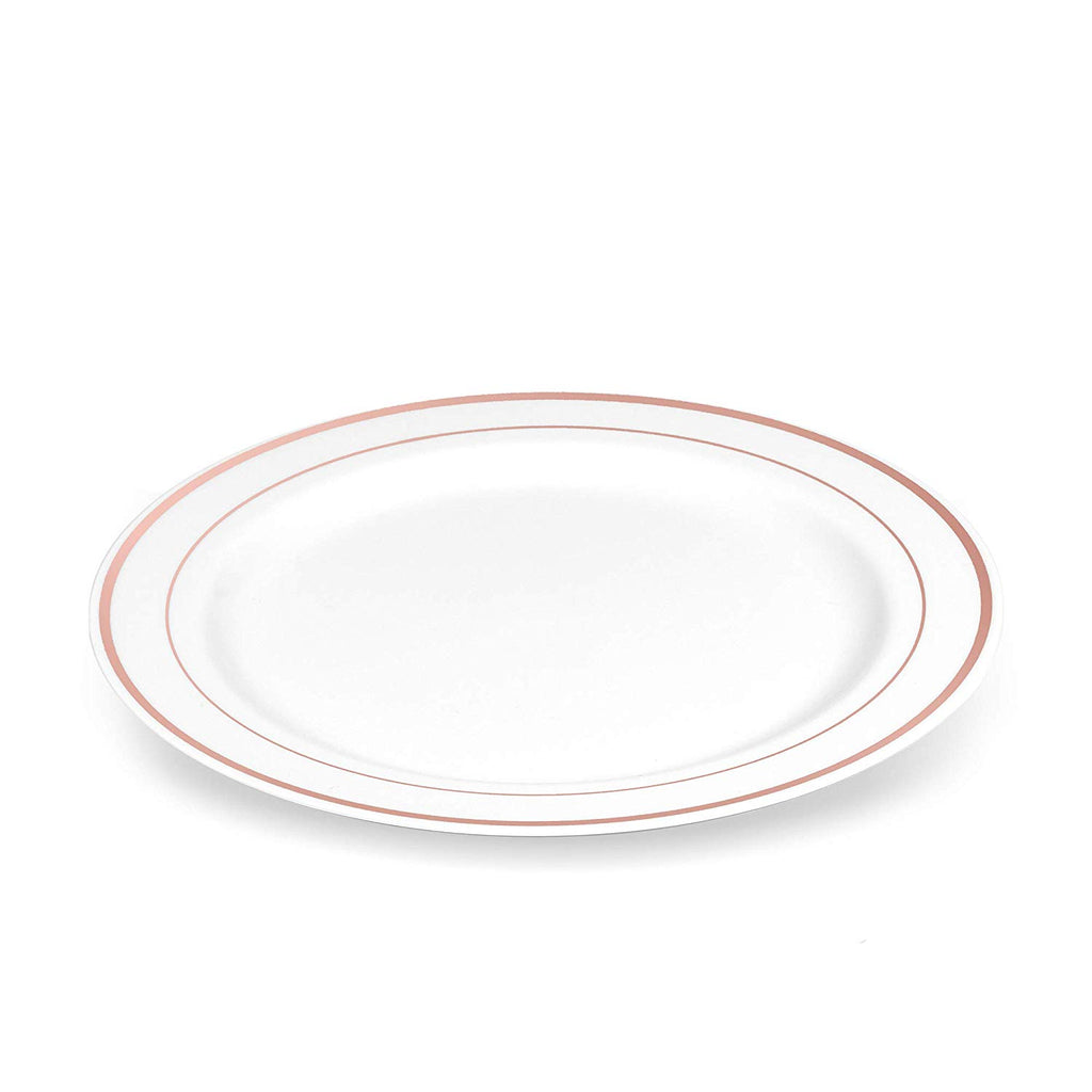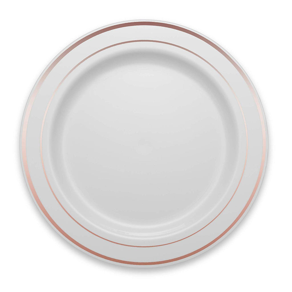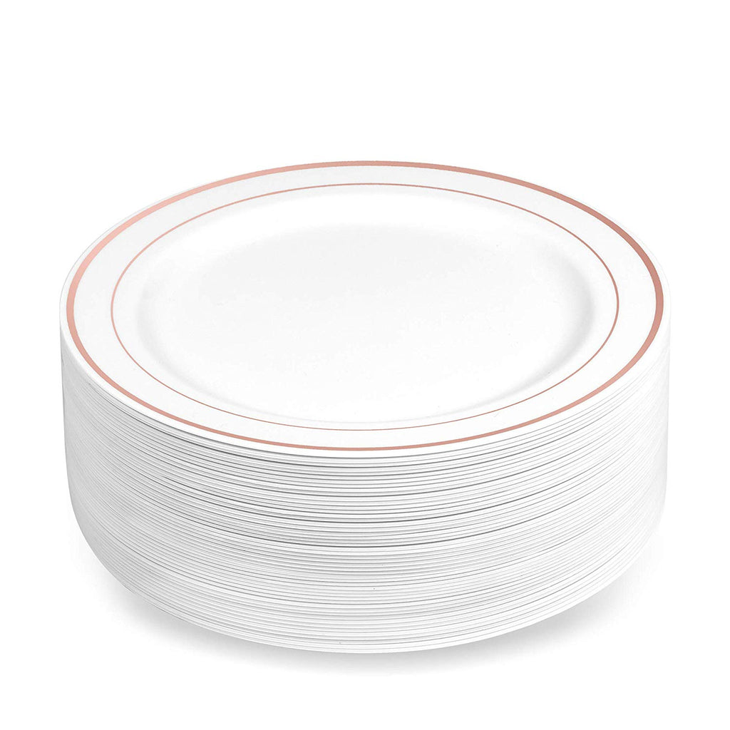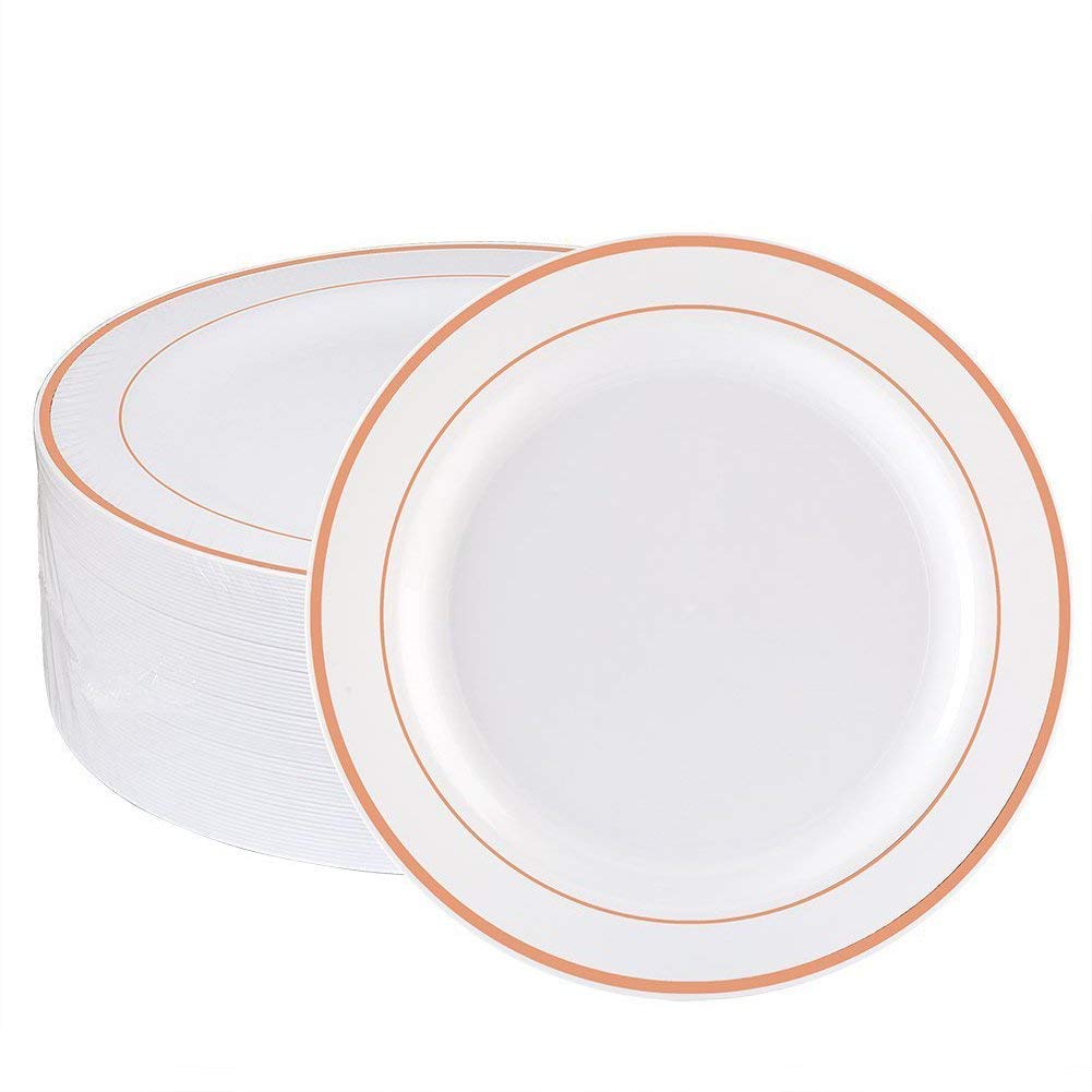 - ELEGANT DESIGN: Boasting a design of a classy and elegant serve ware, disposable plates can be used at weddings, parties, social activities or when you find your regular dinner plates too boring. The high gloss finish and the elegant Rose Gold Trim give them a look which is similar to China or porcelain dishes.