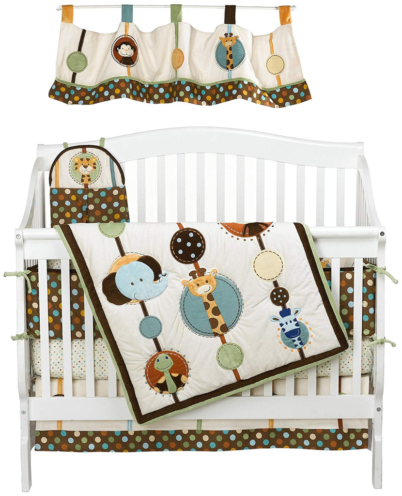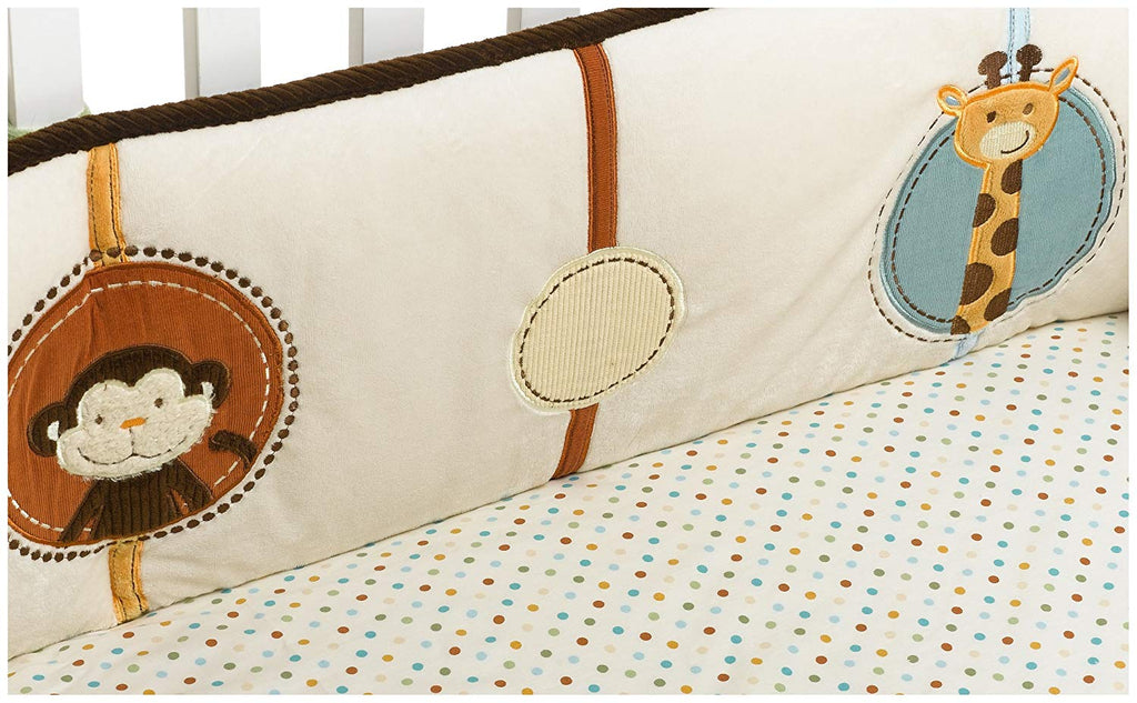 Color:Jungle Tales Product description NOJO Jungle Tales Six Piece Set From the Manufacturer Go wild for NoJo Jungle Tales Infant bedding collection. The 6 piece crib set comes with a comforter, 4 sided bumper, fitted crib sheet, dust ruffle, diaper stacker and window valance. Fun colors in brown, ivory, rust, sage, aqua. Feature an adventuresome monkey, elephant, giraffe, tiger, lion and turtle. It has textures fabrics in corduroy, cotton and velboa plush.