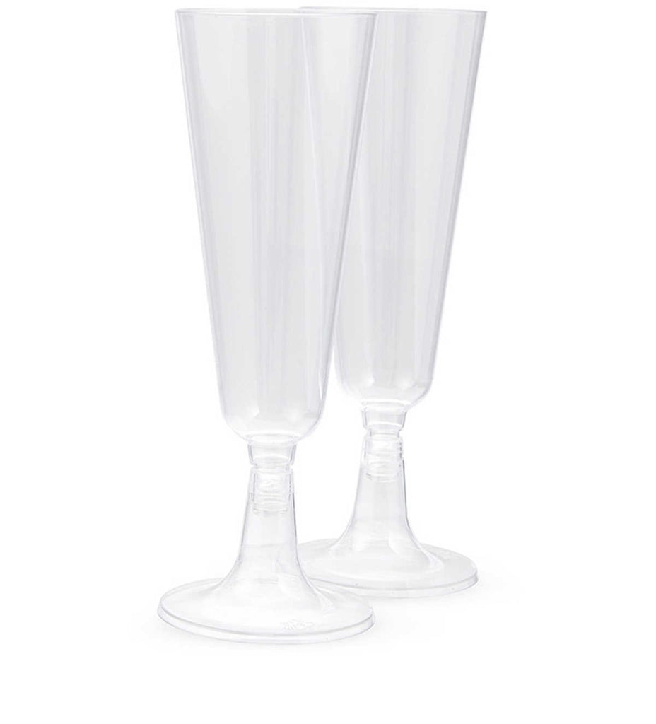 - DISPOSABLE CUPS. Enjoy entertaining instead of cleaning in the kitchen. These flutes are disposable and recyclable for added convenience, plus you don’t have to worry about the risk of broken glass.