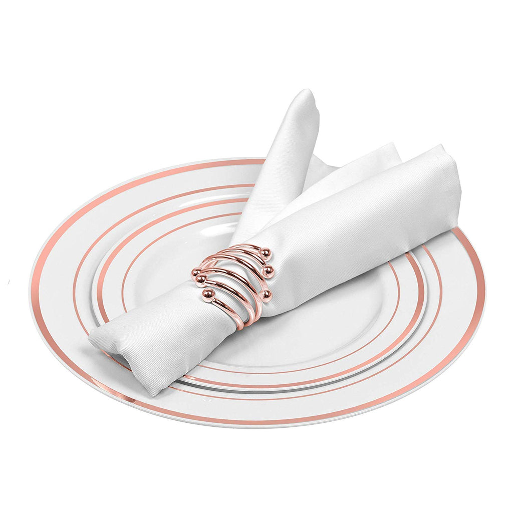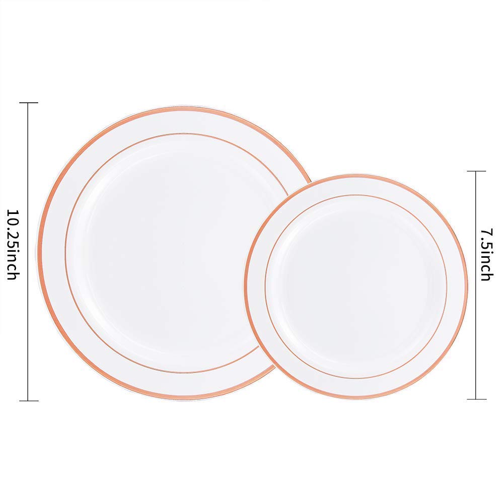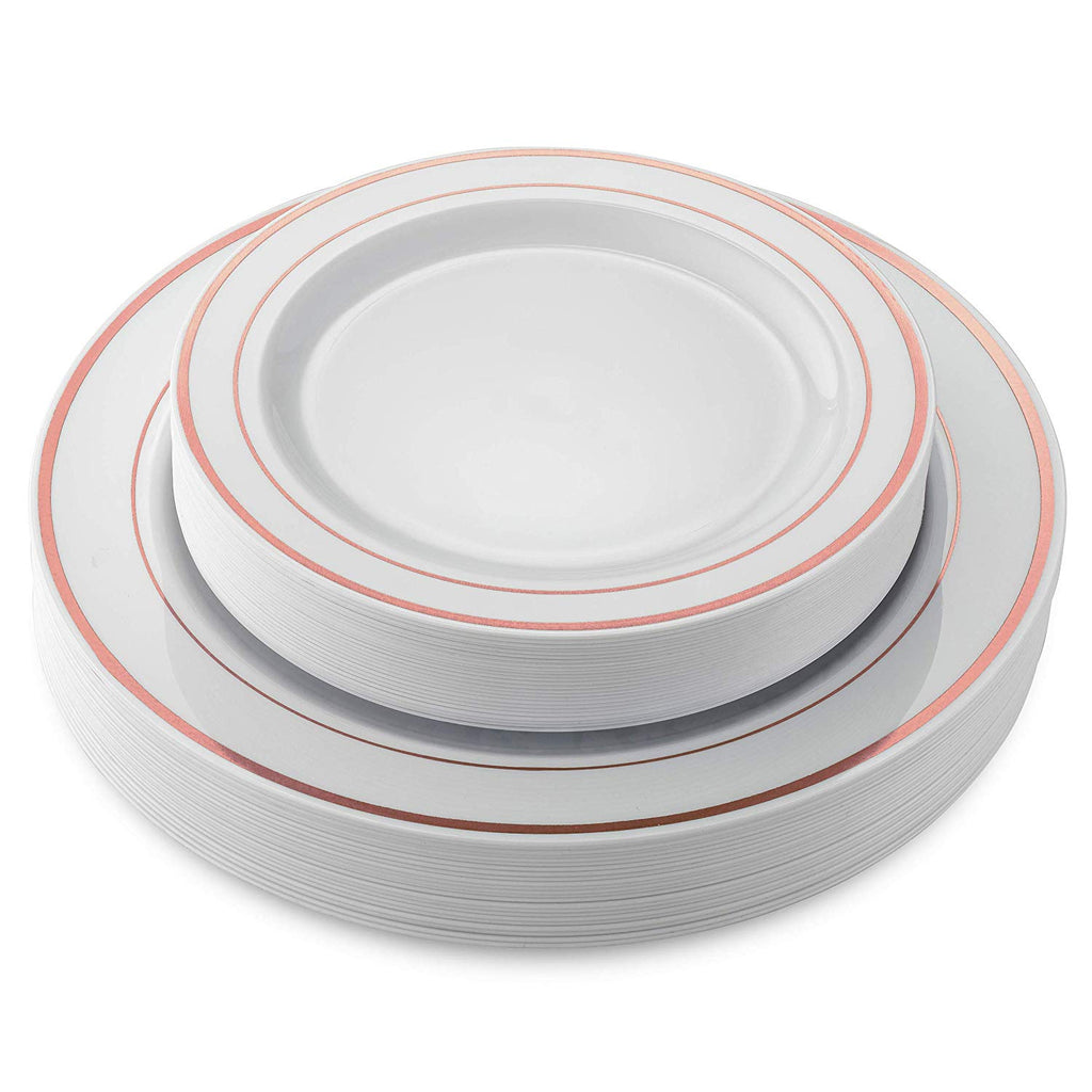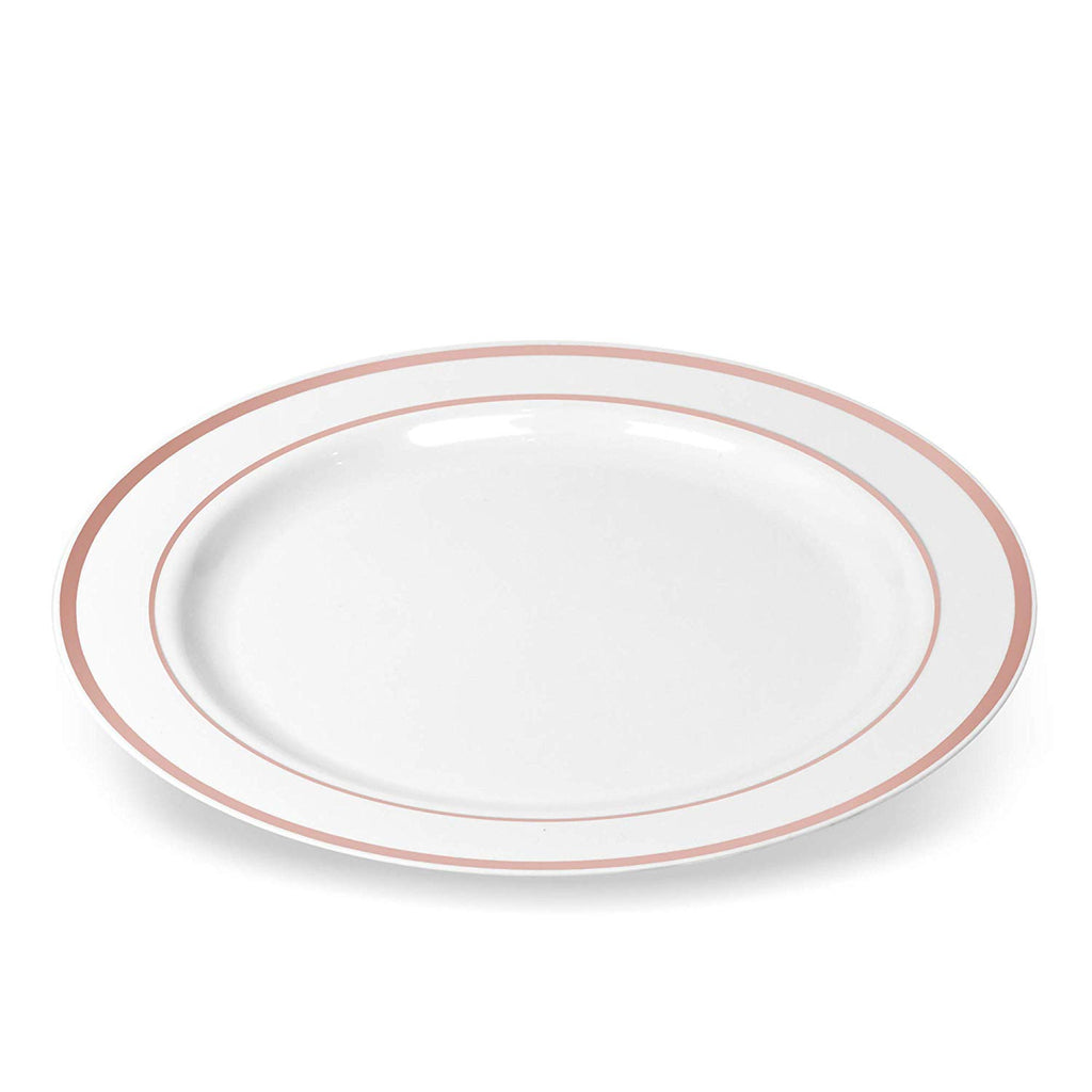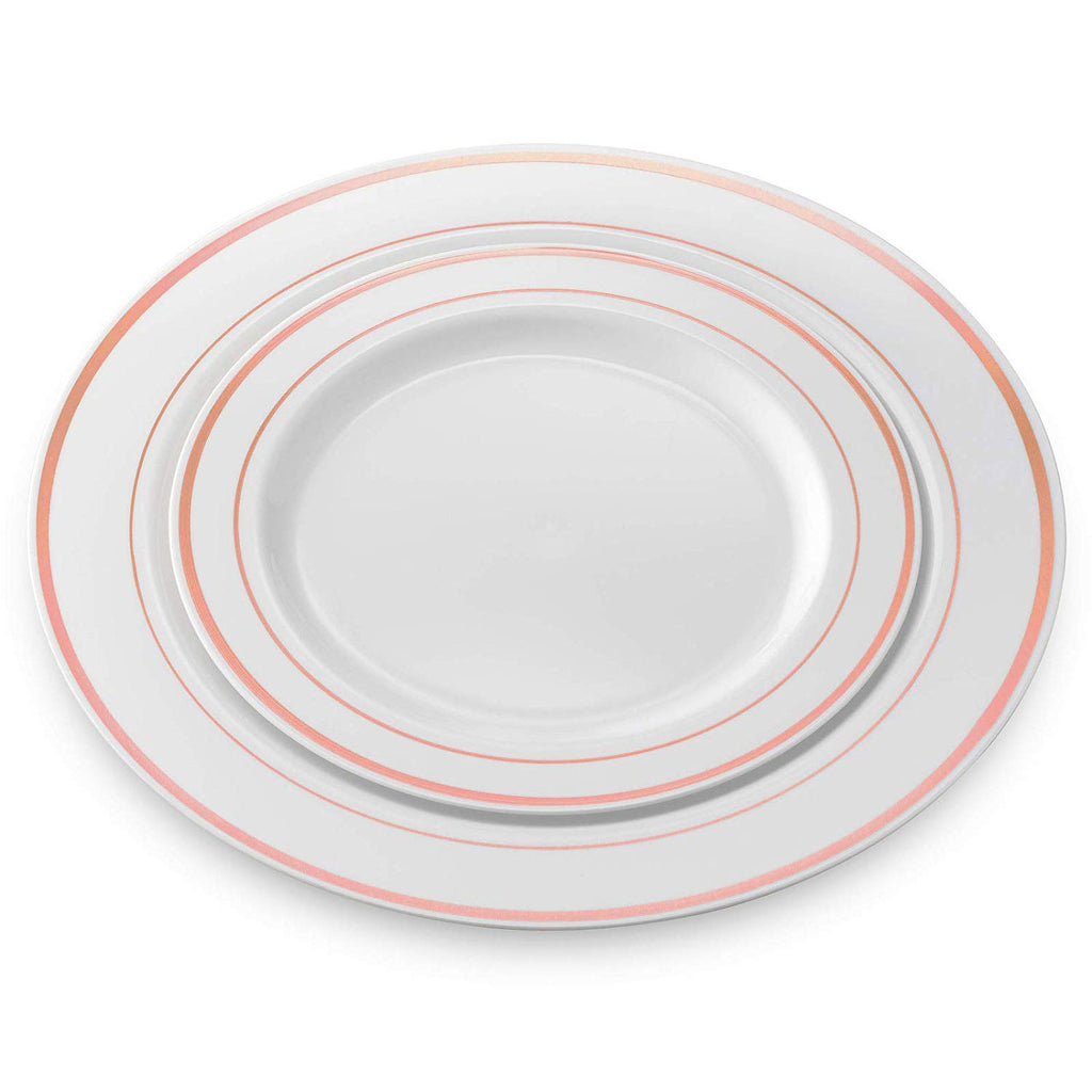 - DISPOSABLE PLATE SET FOR 25 GUESTS. This 50-pack set comes complete with 25 rose gold rimmed dinner plates and 25 rose gold rimmed dessert plates to meet your needs. Use them for any special function – birthdays, anniversary parties, weddings, graduations and more – to serve your guests in style.