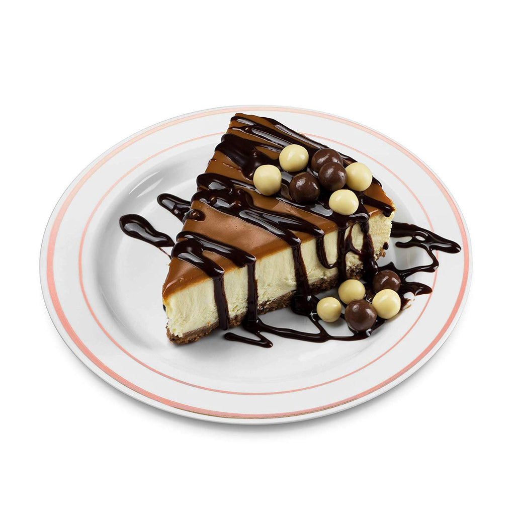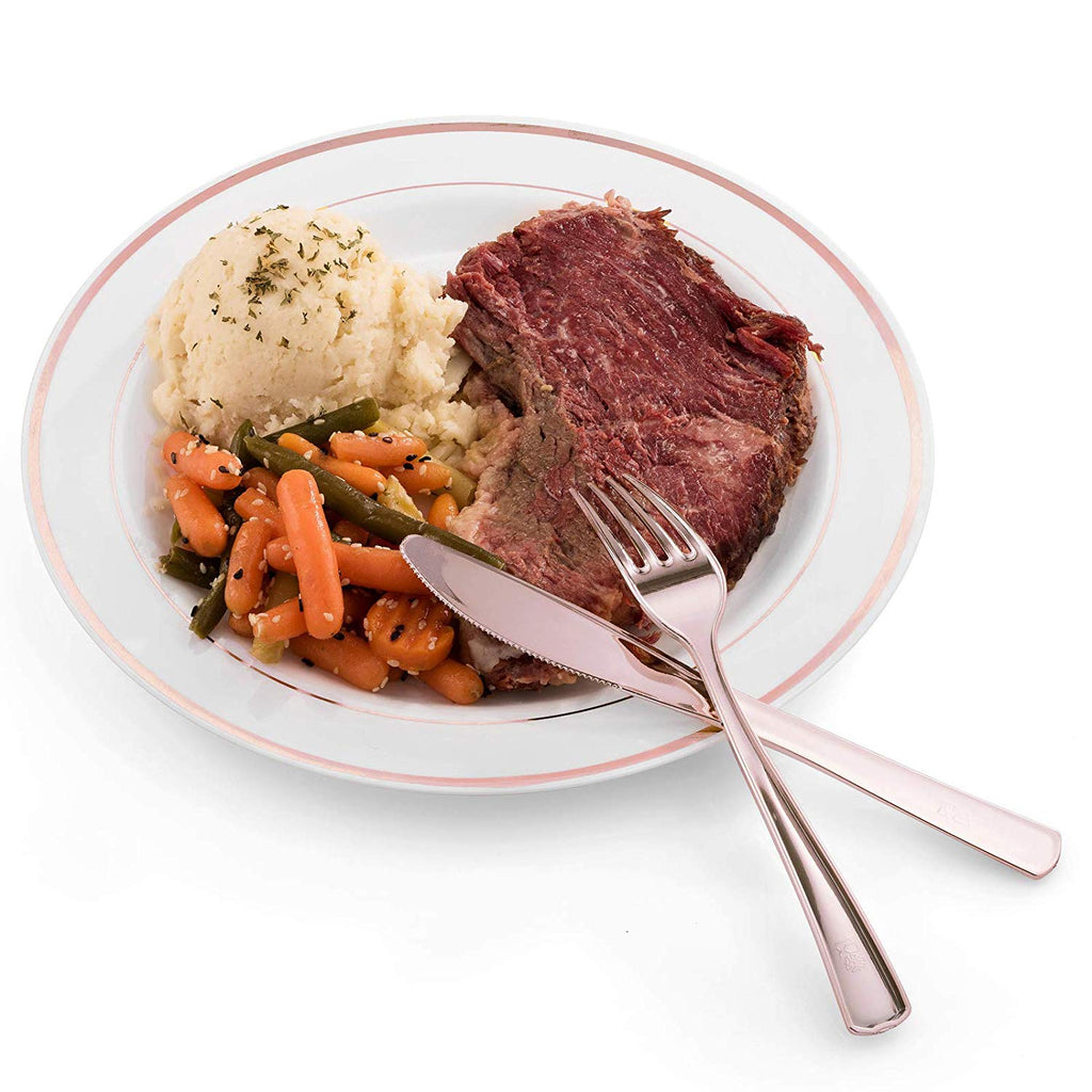 - ELEGANT DESIGN. Available in gold, rose gold and silver color options, these plates look like real tableware. Each plate is rimmed in the color of your choice, popping out against the white background and adding an elegant, modern touch to any event. This set will sparkle and shine as you wine and dine your guests.