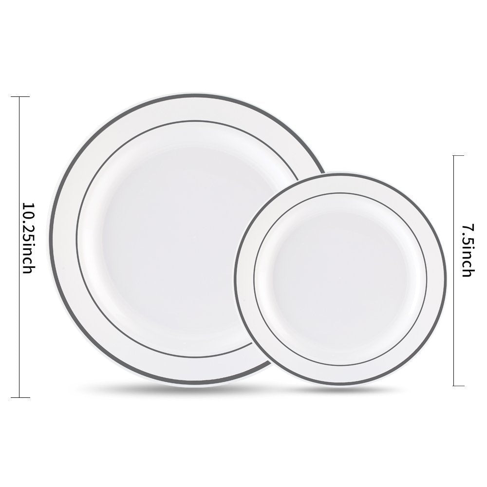 The package includes 50 forks, and 25 spoons, knives, dinner plates and dessert plates to serve a total of 25 guests. While the plates are all adorned with elegant rims making this set a perfect addition for any formal occasion that all your guests will love!