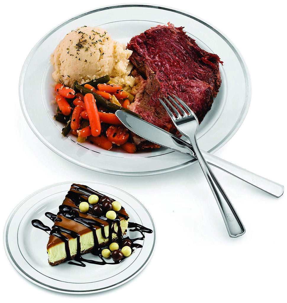 - DISPOSABLE CONVENIENCE. You can save yourself clean-up time with this disposable tableware set, plus you don’t have to worry about expensive flatware being thrown out or china breaking. If you prefer to use them again for future events, all flatware and tableware can be washed by hand and re-used. Consider it for Christmas, parties, dinner, brunch, lunch, bars, nightclubs, bridal shower, bachelorette or engagement parties, weddings, sophisticated events and New Year's Eve parties.