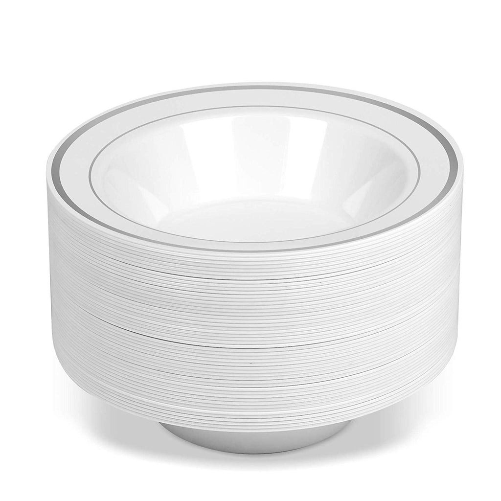 Ideal for weddings, anniversaries, graduations and other important occasions, these white bowls are enhanced with attractive Silver rims to furnish an elegant look in any space. Each bowl boasts a 14-ounce size for soup, salads, runny side dishes, yogurt parfaits, cereals and other liquids, and is outfitted with a wide rim for easy handling and to prevent accidental spills.