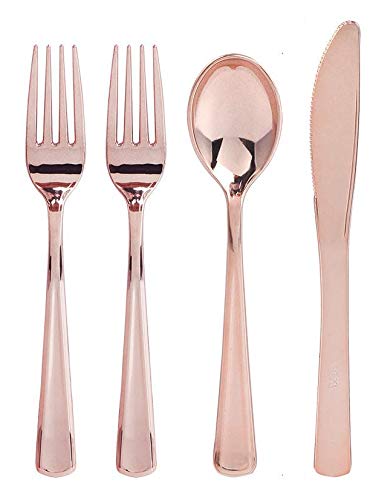 - ELEGANT DESIGN. BloominGoods Rose Gold Plastic Cutlery is available in gold, rose gold and silver, each boasting an elegant, shiny look that is perfect for all occasions. Adding an elegant, modern touch to any event, they look like real metal utensils with sparkle and shine.