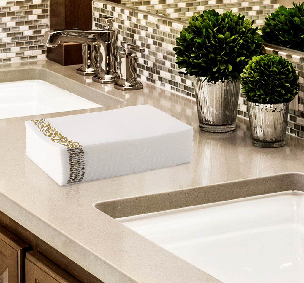BloominGoods Disposable Dinner Napkins & Decorative Bathroom Paper Hand Towels | Soft and Absorbent Linen-Feel Guest Towels for Kitchen, Parties, Weddings, Dinners, Events | White and Gold (100-Pack)